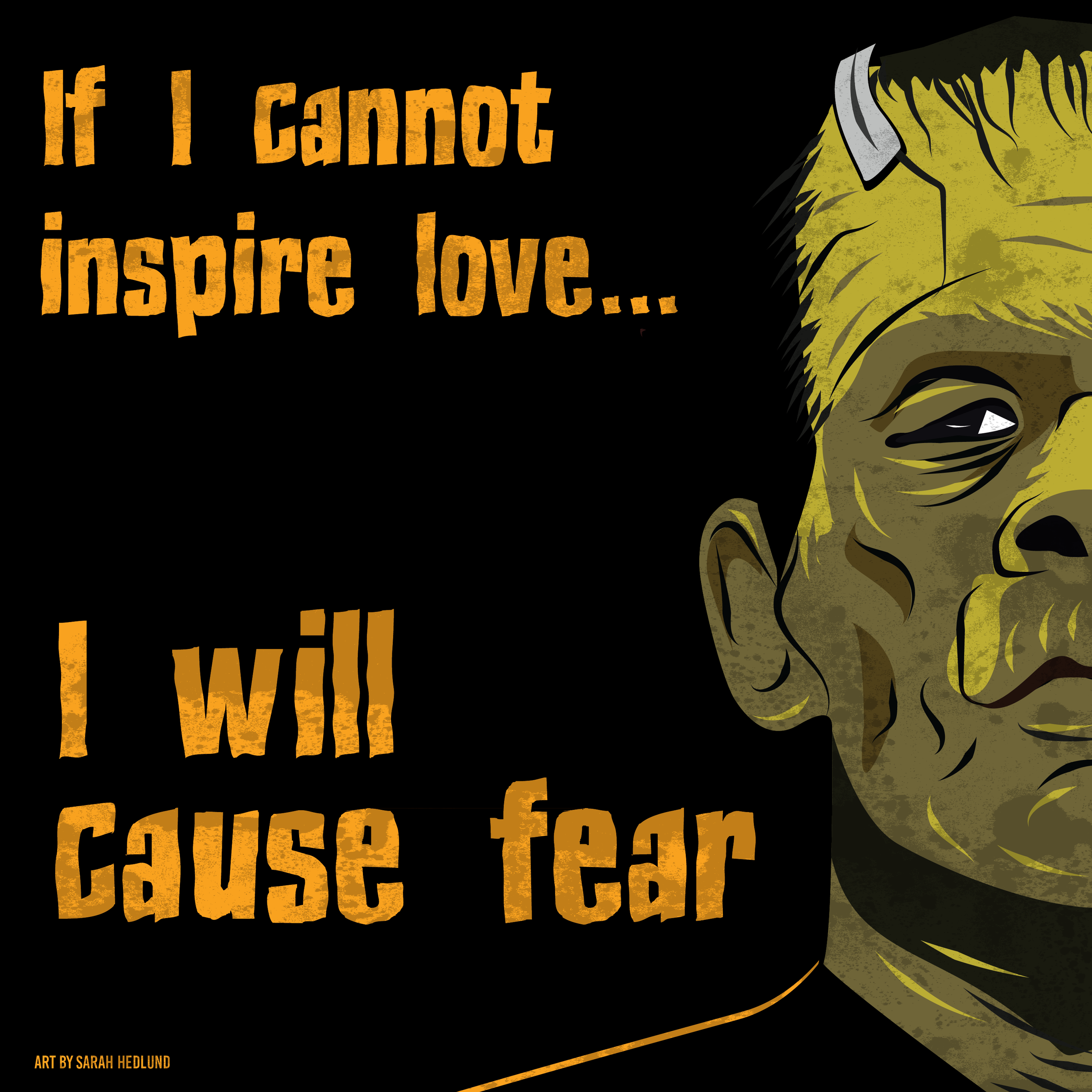 A stylized illustration of a person's face with a serious expression, and a quote in orange text saying, "If I cannot inspire love... I will cause fear." The quote is attributed to Sarah Hedlund.
